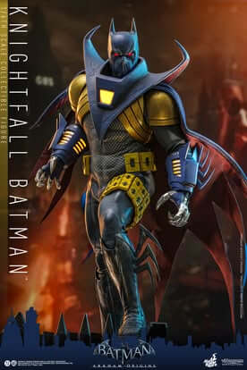 Sideshow and Hot Toys proudly introduce the Knightfall Batman™ Sixth Scale Collectible Figure. The action figure showcases a masked head sculpt with LED light-up function on the eyes, which amplifies the eerie intensity of Batman’s vigilante gaze. His suit is painted in bold gold and blue tones, enriched by armor pieces that display battle-worn weathering. The suit features an LED-lighted large shoulder armor piece, as well as LED-lighted gauntlets, recreating the suit’s intimidating tech. Completing the fierce silhouette is his blue and red wire-embedded cape, while the yellow waist and thigh pouches accentuate the utility look. For dynamic posing and expression of his ferocity, the figure includes six clawed hands, each designed to bring his menacing presence to life. It comes complete with an attachable grappling hook and a stylish figure base to offer dynamic display options.