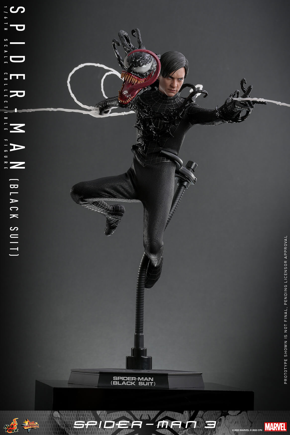Carefully crafted based on the appearance of Tobey Maguire as Spider-Man / Peter Parker wearing Black Suit from Spider-Man 3, the one-sixth scale figure features a newly developed head sculpt with separate rolling eyeball system, an interchangeable masked head; a greatly-poseable body for dynamic poses; faithful recreation of the black suit with raised silver webbing patterns; accessories such as alien symbiote arms and head with protruding tongue, Spider-Man mask, assorted spider-web webbing accessories, and a themed display base.