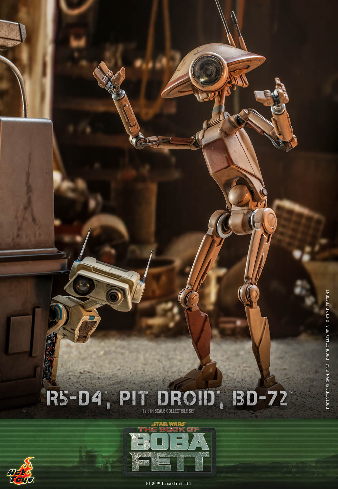 Standing at approximately 20cm tall for R5-D4, 22cm tall for the Pit Droid, and 8cm for BD-72, the three droids are crafted with exceptional mechanical details. They also feature weathered paint applications and great articulations.