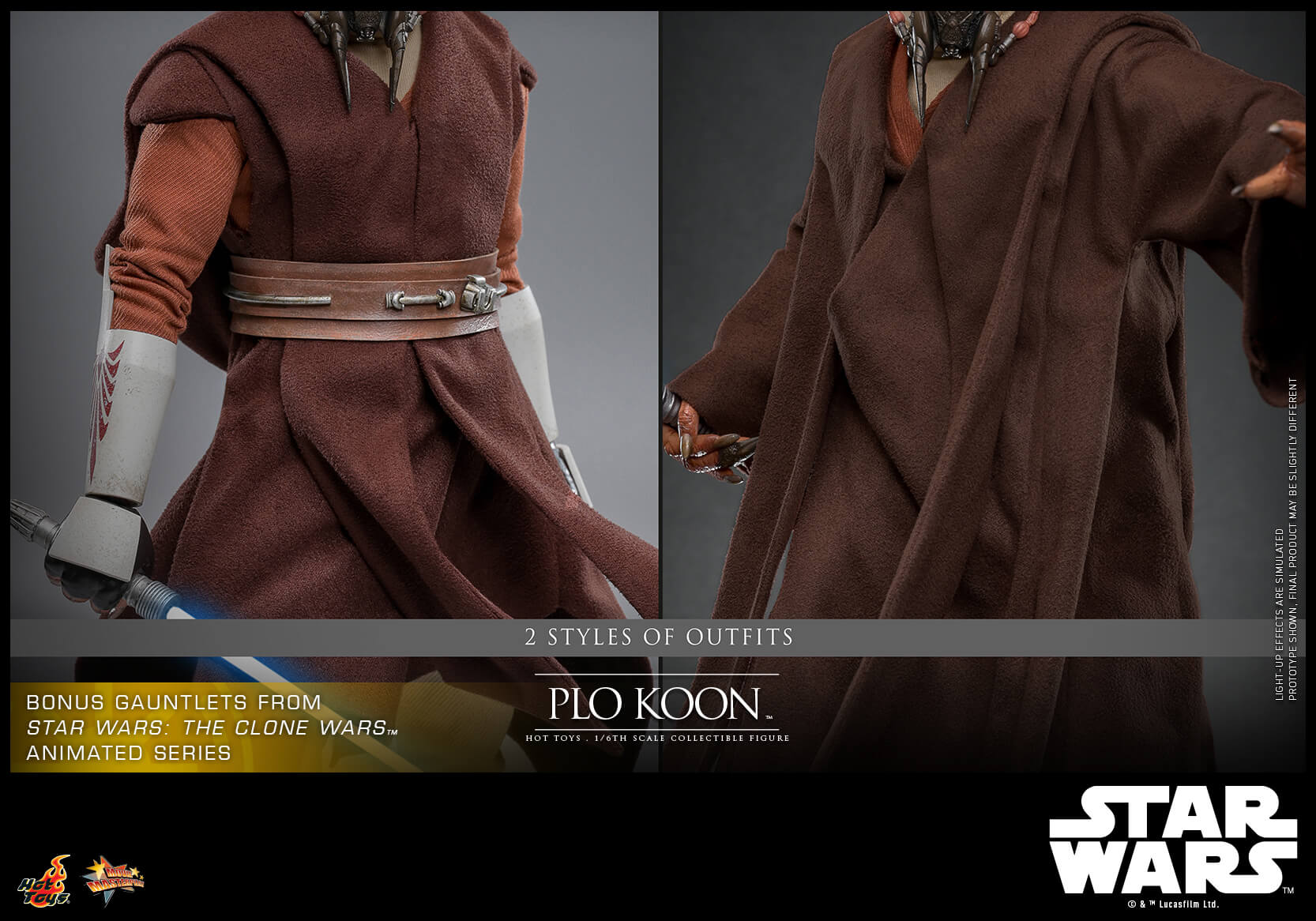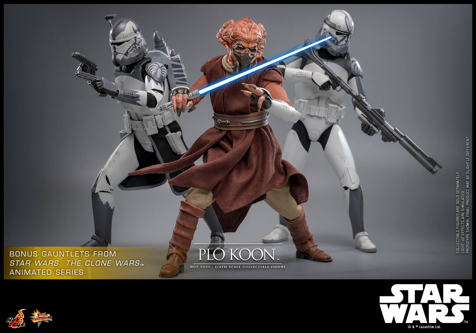 The highly-accurate collectible figure features a detailed recreation of Plo Koon’s distinctive head sculpt with exceptional paint applications and likeness, a bonus pair of gauntlets to recreate his appearance in Star Wars: The Clone Wars™ animated series, finely tailored Jedi robe and tunic, a LED light-up lightsaber, a cloak and a display base!