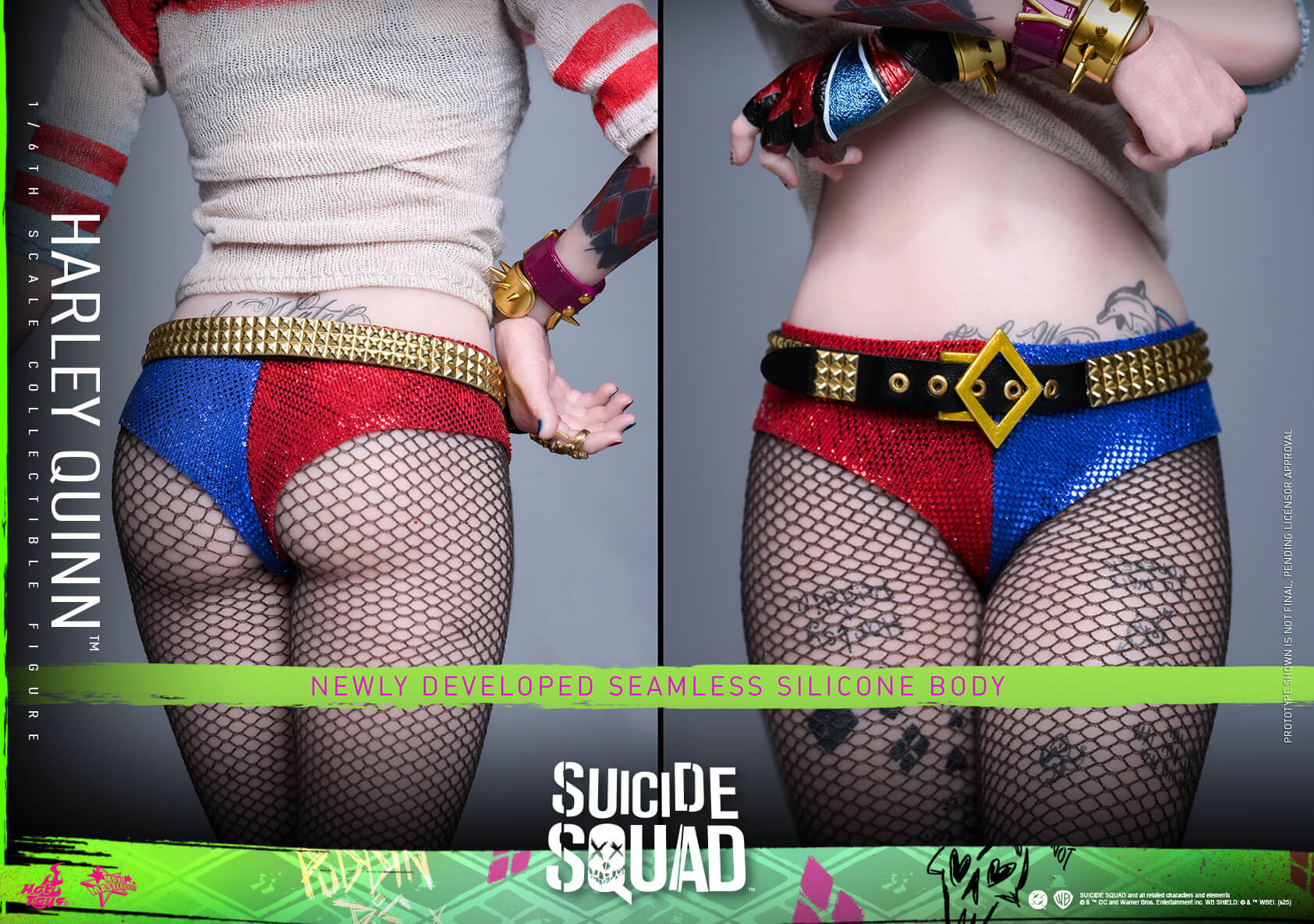 This collectible action figure features a screen-accurate head sculpt with separate rolling eyeballs and a hair sculpt of her iconic blonde, blue, and pink pigtail hair style. The newly developed body, made from silicone material, features a seamless design throughout and a specialized metal armature inside that allows for a wide range of articulation. Its body shape beautifully enhances the character’s feminine curves, and it's intricately detailed with tattoos. Harley Quinn’s costume is a masterful replica, featuring her finely tailored T-shirt, baseball jacket, holster strap, hot pants and fishnet tights. Her high heels, belt, choker, and bracelets are recreated with meticulous detail, capturing the character’s iconic look from the film. Her weaponry includes a baseball bat, a mallet, and a revolver pistol with two speed loaders. The set also comes with a silver-colored handbag and a figure base with glass shard details, allowing fans to recreate the scene where Harley breaks the glass window of a storefront display to steal a purse.