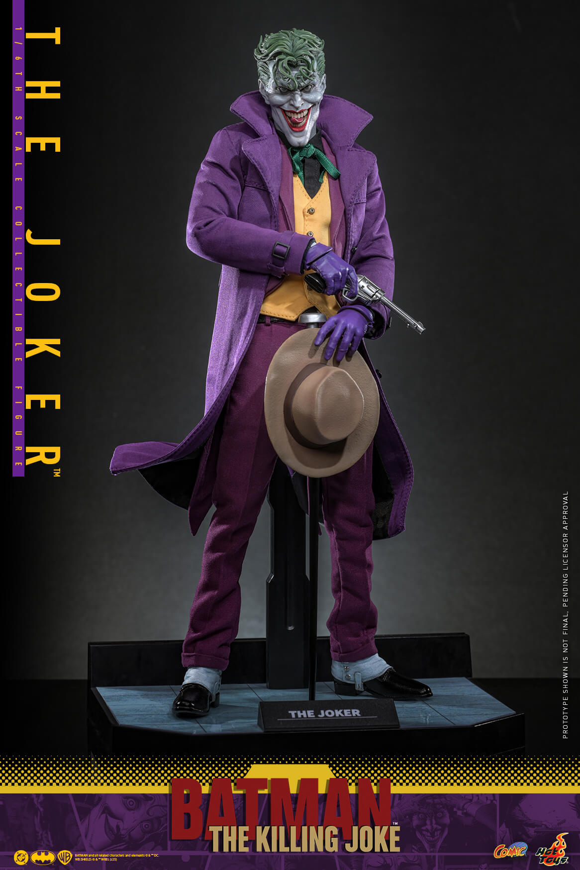 Sideshow and Hot Toys is proud to present the The Joker Sixth Scale Collectible Figure, inspired by the comic Batman: The Killing Joke. The action figure includes two newly developed head sculpts equipped with rolling eyeballs, detailed wrinkles, make-up, and meticulously sculpted curly green hair that completes the haunting visage. One head sculpt features an open-mouth grinning expression, with a magnetically attachable tongue; the other has a winking and grinning expression, with a removable hat that is interchangeable with both head sculpts. The Joker is dressed in his comic-accurate attire, coming with a wire-embedded purple coat and jacket over a yellow waistcoat, black shirt, green ribbon, black belt, and purple pants paired with black shoes. Coming with eight interchangeable gloved hands, collectors are able to pose him with his iconic expressive poses. True to the original panels, his weapons come with a small knife and a pistol that shoots a “Click Click Click” flag. Also included are a camera, a cane, and a Joker card. Completing the setup is a backdrop featuring the comic cover art of Batman: The Killing Joke, which is mountable to the specially designed figure stand.
